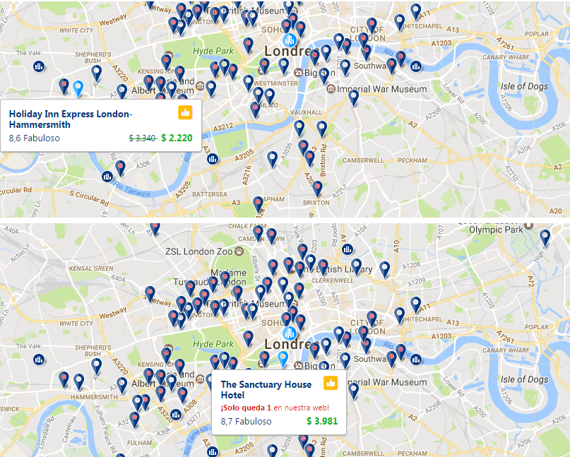 Booking tiene la opción de Ver en mapa, donde podemos observar los alojamientos disponibles distribuidos en el mapa de la ciudad. En Londres, por ejemplo, podemos ver la diferencia entre quedarse una noche en Hammersmith y quedarse en el centro. Los dos son hoteles tres estrellas, con cancelación gratuita y puntuación fabulosa, y aún así hay mucha diferencia en los precios (el de Hammersmith incluso incluye desayuno, mientras que en el otro hay que hablar de $219 extra por persona). Reconozco también que depende un poco de buscar y de cuán dispuestos estamos a movernos para ir y venir desde el centro (además de considerar que el transporte también es un gasto más si necesitamos movernos mucho). Hay mucha variedad de precios también dependiendo del hotel al que vayamos y los servicios que incluyen.
