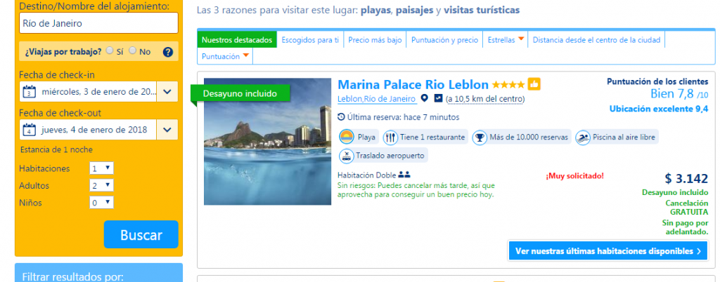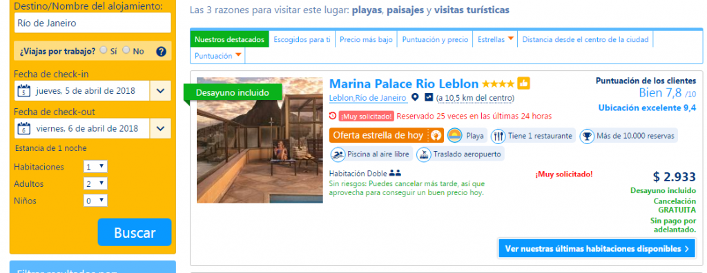 Las fechas. Ah, sí, ese siempre es un dilema. Yo amo viajar durante las fiestas de fin de año, y sé que es probable que los precios suban un poco para esa época. ¿La solución? Siempre buscamos ofertas, tratamos de reservar con anticipación, ir a ciudades que de por sí son baratas para pasar los días festivos y, obviamente, resignar algunas comodidades durante esas fechas particulares. Por lo general, los precios altos en invierno duran poco y después enero se vuelve un mes bastante económico para recorrer el hemisferio norte. En el caso del sur, lamentablemente es temporada alta, pero siempre se pueden buscar alternativas por otro lado o resignar la fecha para reducir costos. Acá, por ejemplo, una pequeña muestra de lo que pasa con los hoteles de Río de Janeiro cuando dejamos de viajar en Enero y nos vamos en Abril. No es una barbaridad de diferencia por una noche, pero si nos vamos varios días ya el número empieza a ser más significativo: