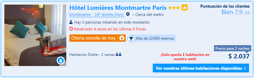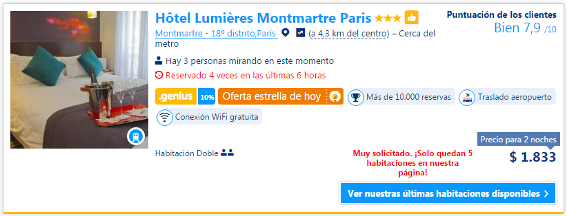 Y acá la diferencia del precio regular y el precio genius de un hotel sencillo en París, en el popular barrio de Montmartre, en las mismas fechas (13 a 15 de diciembre). El descuento aparece una vez que estamos logueados (y después de haber contratado y estado alojados en más de cinco hoteles por la página). Es un 10%, que en los casos puntuales no parece hacer la diferencia, pero cuando empezamos a sumar alojamientos resulta ser que nos ahorramos bastante: