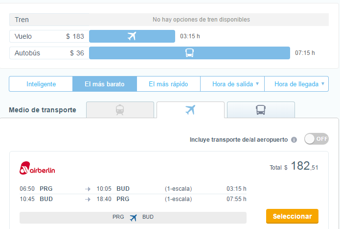 En el caso de la búsqueda realizada, de Praga a Budapest, nos indica que no hay trenes disponibles en la base de datos, pero si nos da opciones de vuelos y micros. Tiene varios criterios para ordenar los distintos tipos de transporte. Además de separar entre trenes, aéreos y micros (también incluye car pooling), podemos elegir ver la búsqueda en orden de precio más económico por transporte (foto, con valores expresados en dólares), el más rápido, seleccionar una hora de llegada o salida, o “inteligente”. Esta última opción selecciona lo que para el sistema es la opción más conveniente (una combinación entre duración, precio, escalas, etc).