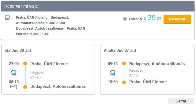 En este caso, nos permite comparar directamente vuelos y micros, para poder evaluar si vamos a priorizar la duración del viaje por sobre el costo. Como siempre digo, es todo relativo al tipo de viaje que estemos haciendo, a la cantidad de días que tengamos para cada ciudad y cuán pacientes seamos a la hora de viajar. Si pueden sacar los traslados antes de los hoteles, también hay chances de que puedan ahorrarse algún alojamiento en el camino. En este caso, por ejemplo, hay un bus que sale a las 23hs de Praga, llegando a Budapest a las 6hs. Si van ligeros de equipaje o pueden dejar las valijas en el hotel, es una buena opción para hacer este recorrido, sin tener que pagar esa noche de alohamiento. Hay que tener en cuenta que muchos trenes y micros no están disponibles sino dos o tres meses antes de la fecha de viaje, por lo que no es una buena opción si son super previsores a la hora de reservar el lugar donde van a hospedarse.