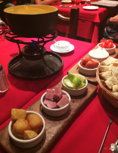El ambiente es agradable, rústico y cálido, tranquilo incluso en una noche de enero donde las calles estaban bastante concurridas. Nos atendieron rápido y no pudimos hacer más que pedir la fondue de queso para compartir y dos cervezas artesanales. Además del típico pan, te traen una tabla de tomatitos cherry, cebollines, salchichas, jamón, manzana verde y otros acompañamientos, con un queso que es para chuparse los dedos (como pueden ver en la foto). La fondue estaba algo de 380 pesos argentinos, lo que no es una locura donde comen dos (teniendo en cuenta que es un plato de por sí caro). Además, cuentan con otros platos con muy buena pinta, pero sin dudas este es su plato especial. No llegamos a la carta de postres, pero también hay muy buenas opciones, incluso fondue de chocolate.